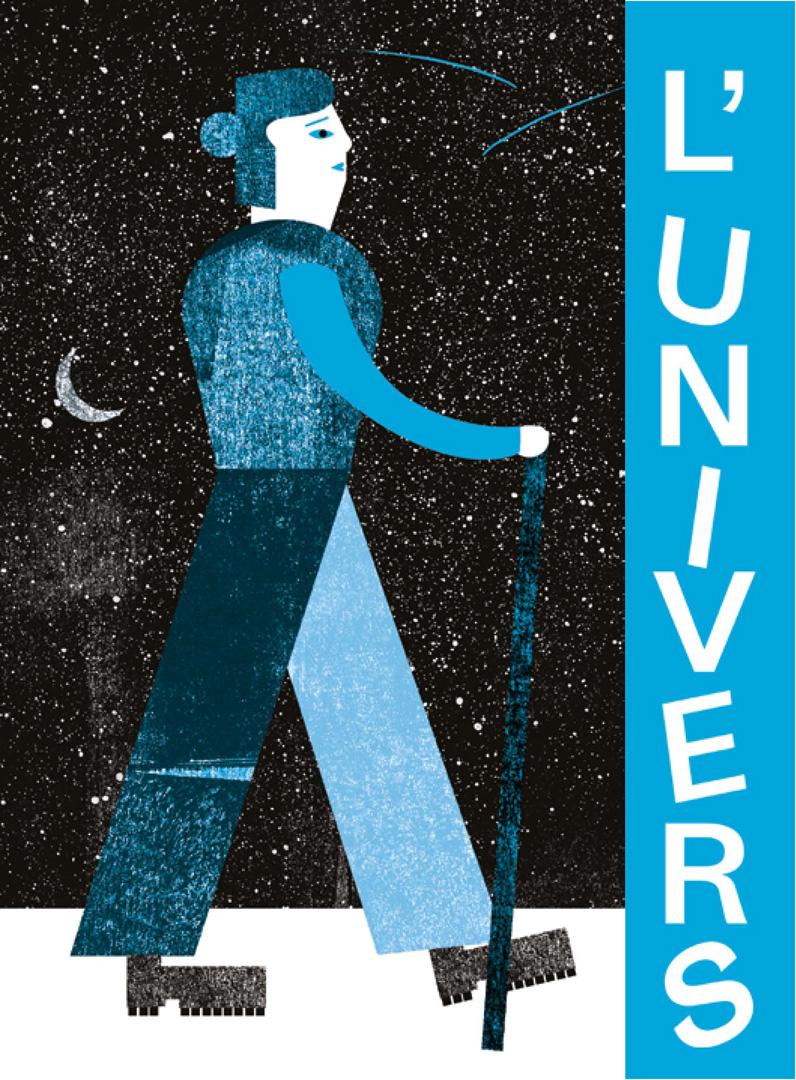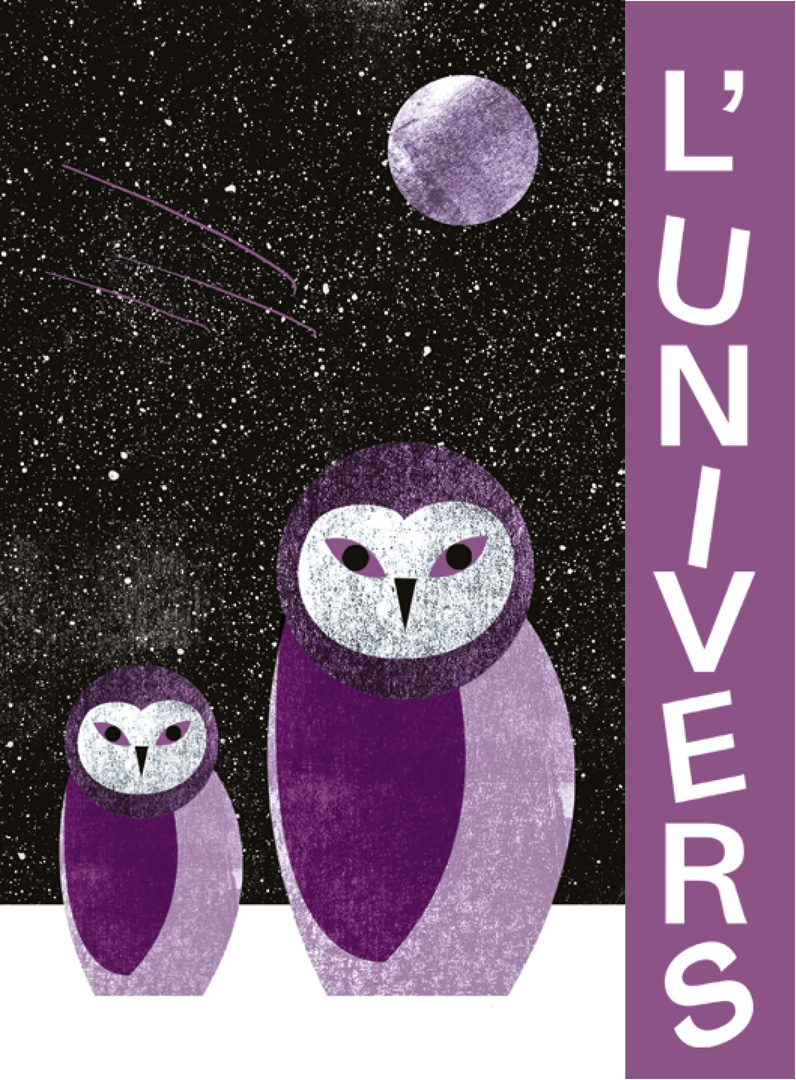 Un cinéma associatif, un lieu d'expression, de rencontres et d'échanges. Une création graphique "carte blanche" selon une intention initiale. Je me suis inspirée du poème de Raymond Queneau "Les animaux astronomes" Le texte représente assez bien l’harmonie liant l’univers aux animaux. Deux mondes me permettant de jouer avec la bichromie, consigne imposée.