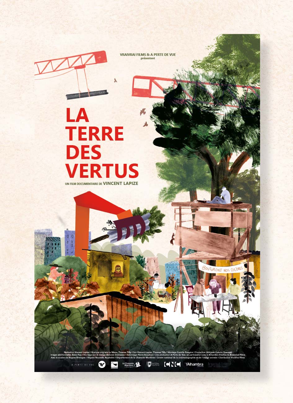 J’ai illustré et élaboré la mise en page de l'affiche du film documentaire La Terre des Vertus, réalisé par Vincent Lapize.