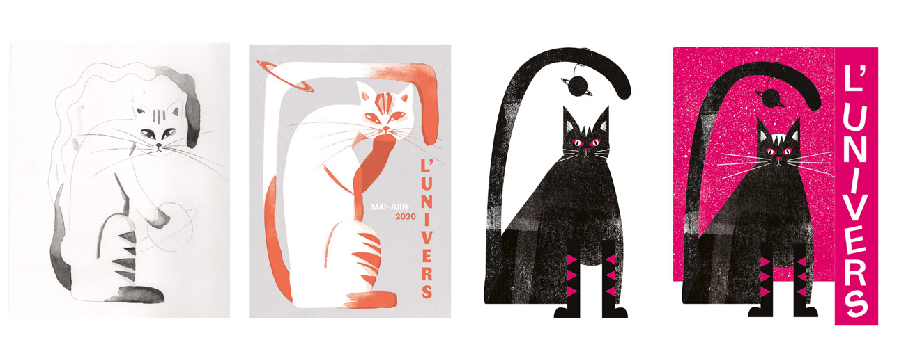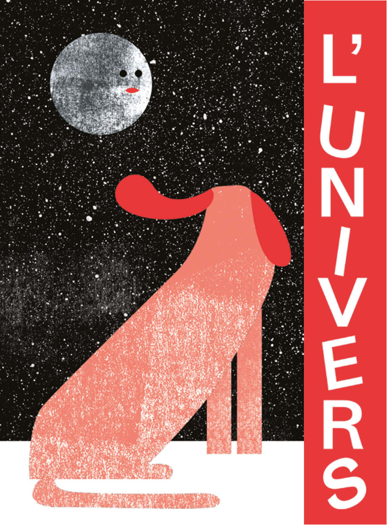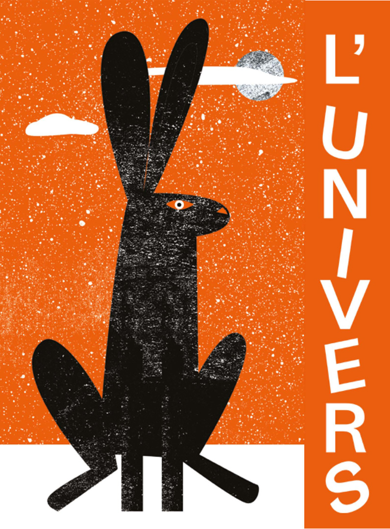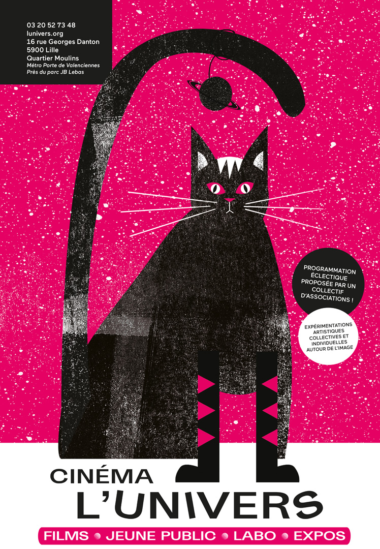 Un cinéma associatif, un lieu d'expression, de rencontres et d'échanges. Une création graphique "carte blanche" selon une intention initiale. Je me suis inspirée du poème de Raymond Queneau "Les animaux astronomes" Le texte représente assez bien l’harmonie liant l’univers aux animaux. Deux mondes me permettant de jouer avec la bichromie, consigne imposée.